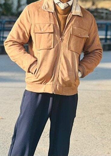 Experience refined winter style with the Caramel Brown Shearling Bomber, crafted with a warm suede-feel exterior, a soft faux-shearling collar, and a quilted insulated lining for superior cold-weather comfort. Designed with ribbed cuffs and hem, dual utility flap pockets, and a smooth front zip, this jacket delivers a structured, modern bomber silhouette that enhances any winter outfit.