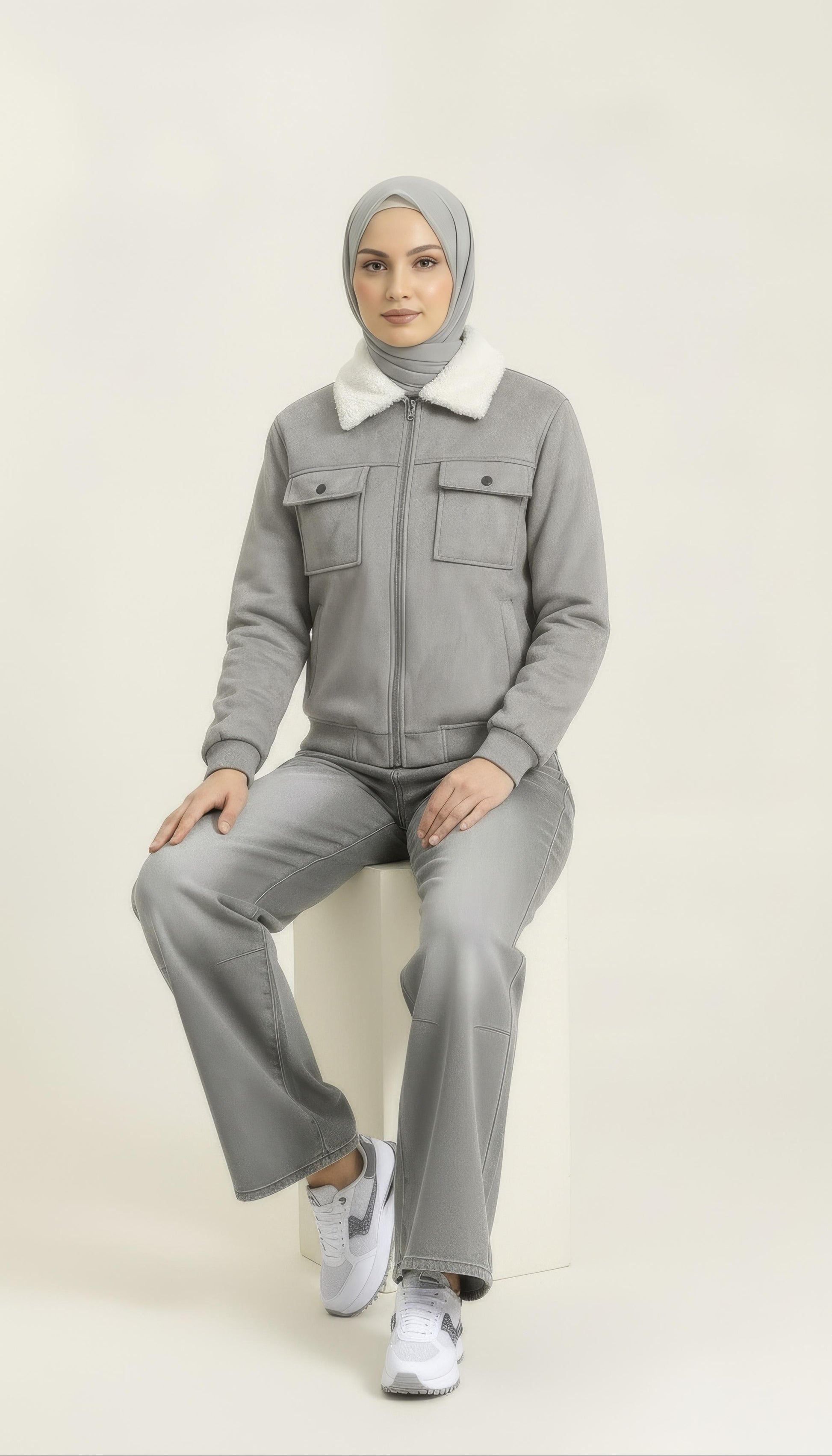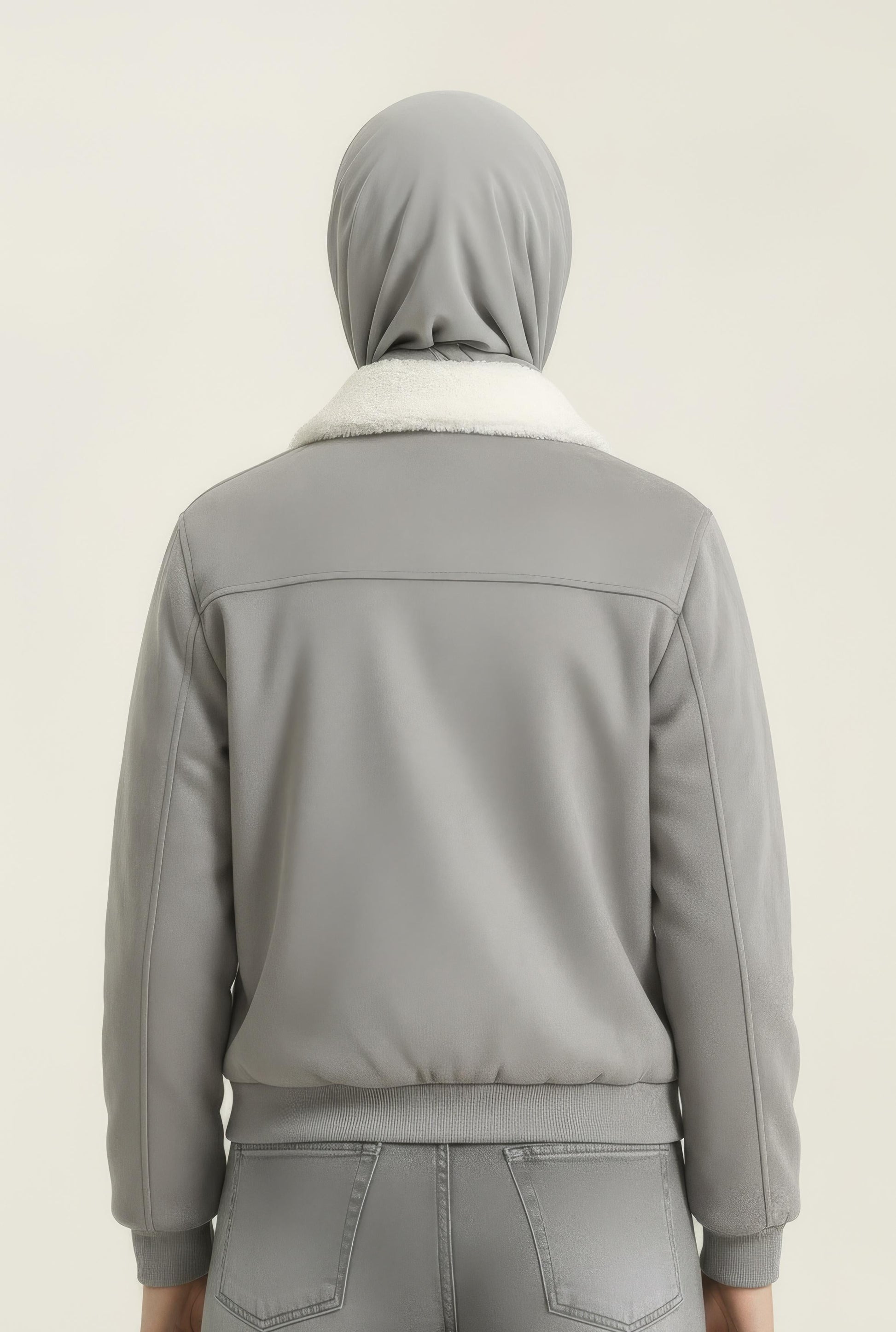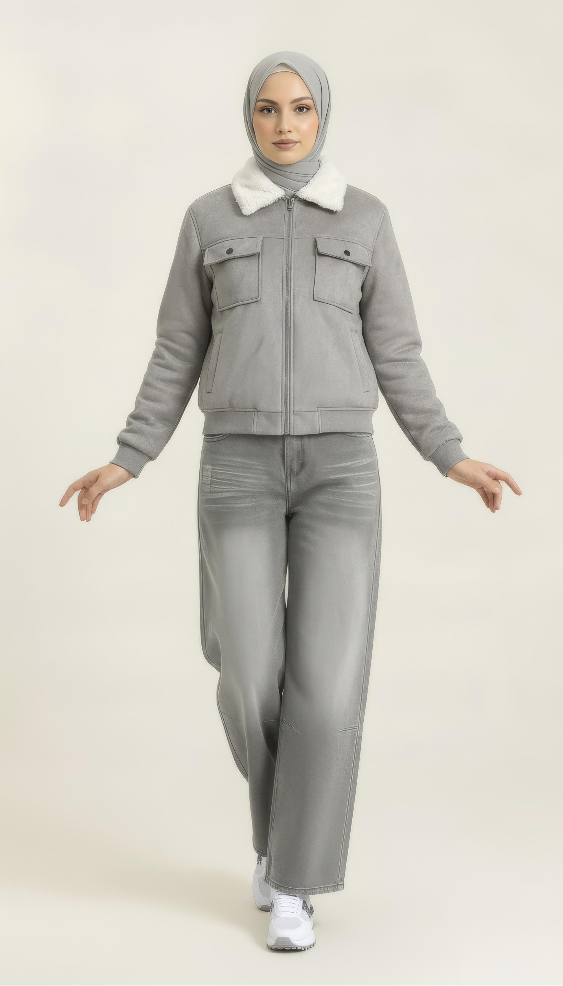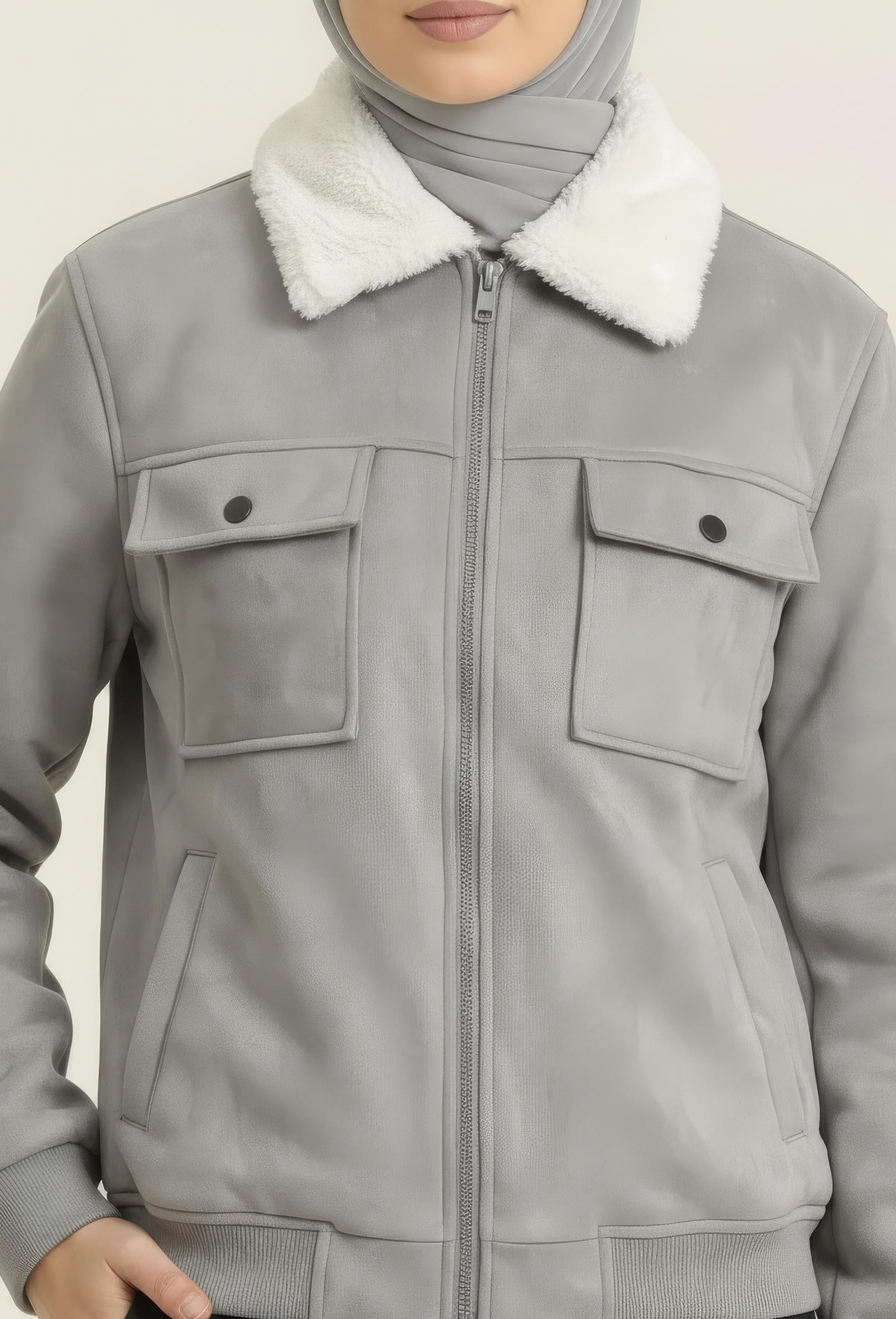 Step into winter with understated luxury with the Frost Dove Shearling Bomber, crafted in an elegant dove-grey tone with a soft suede-feel exterior and a plush white shearling collar. Designed for style-driven winter layering, this bomber delivers warmth without compromising on modern feminine silhouette. The structured cut, clean design lines, and premium hardware elevate the look effortlessly — perfect for winter meetups, streetwear styling, and elevated day-to-evening outfits.