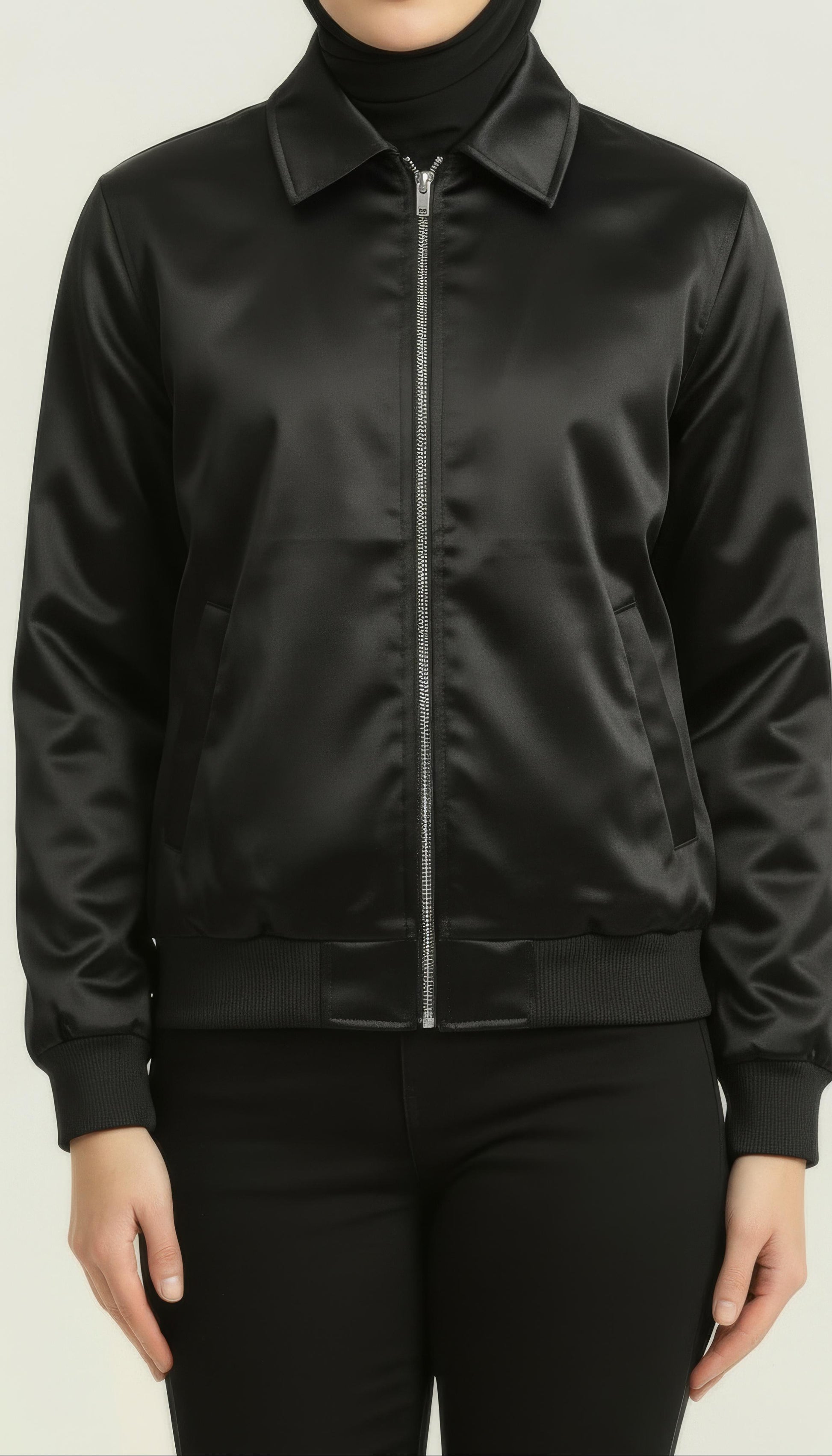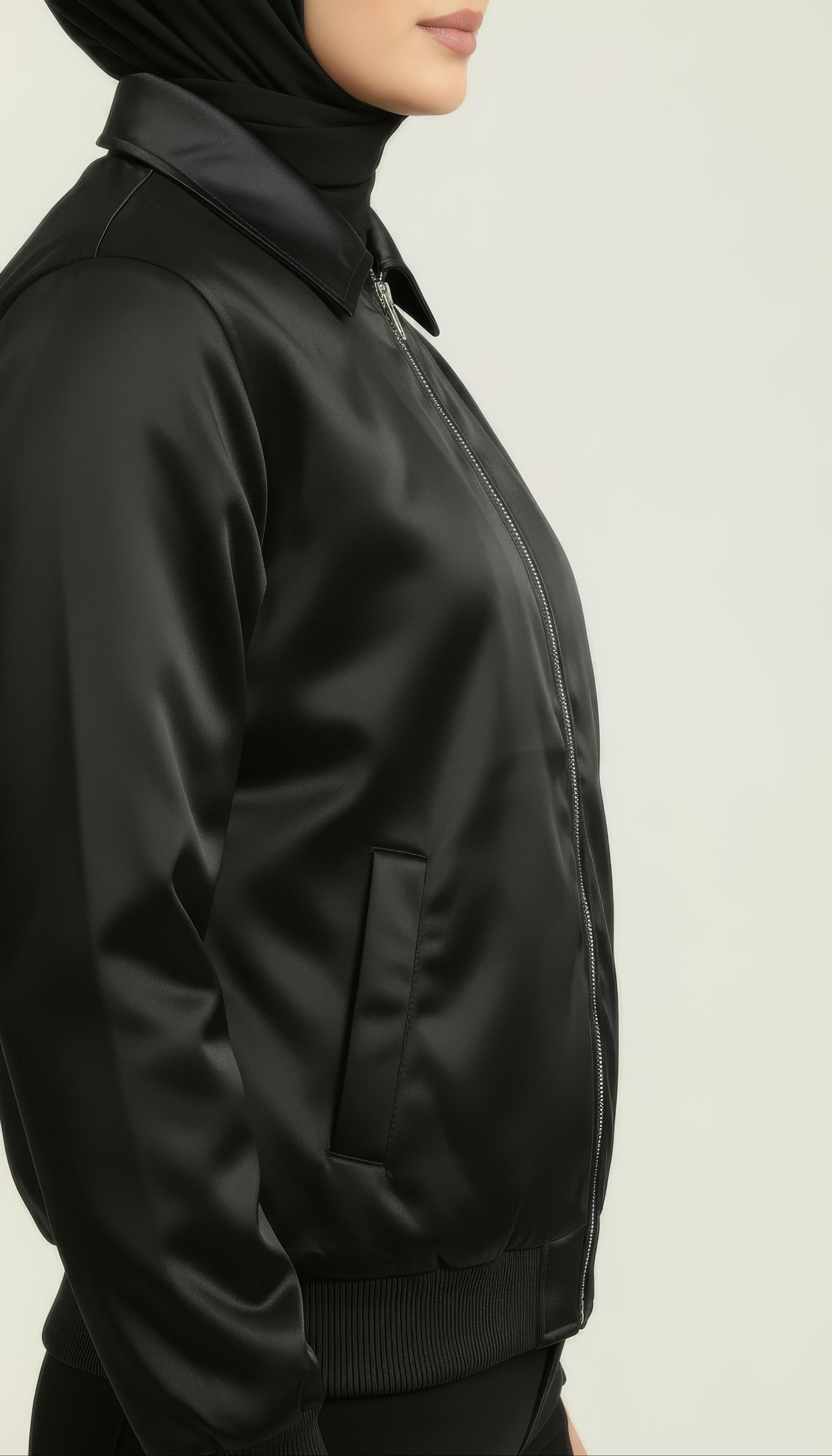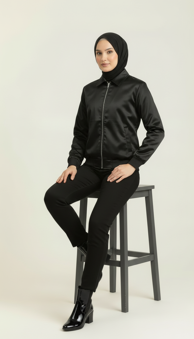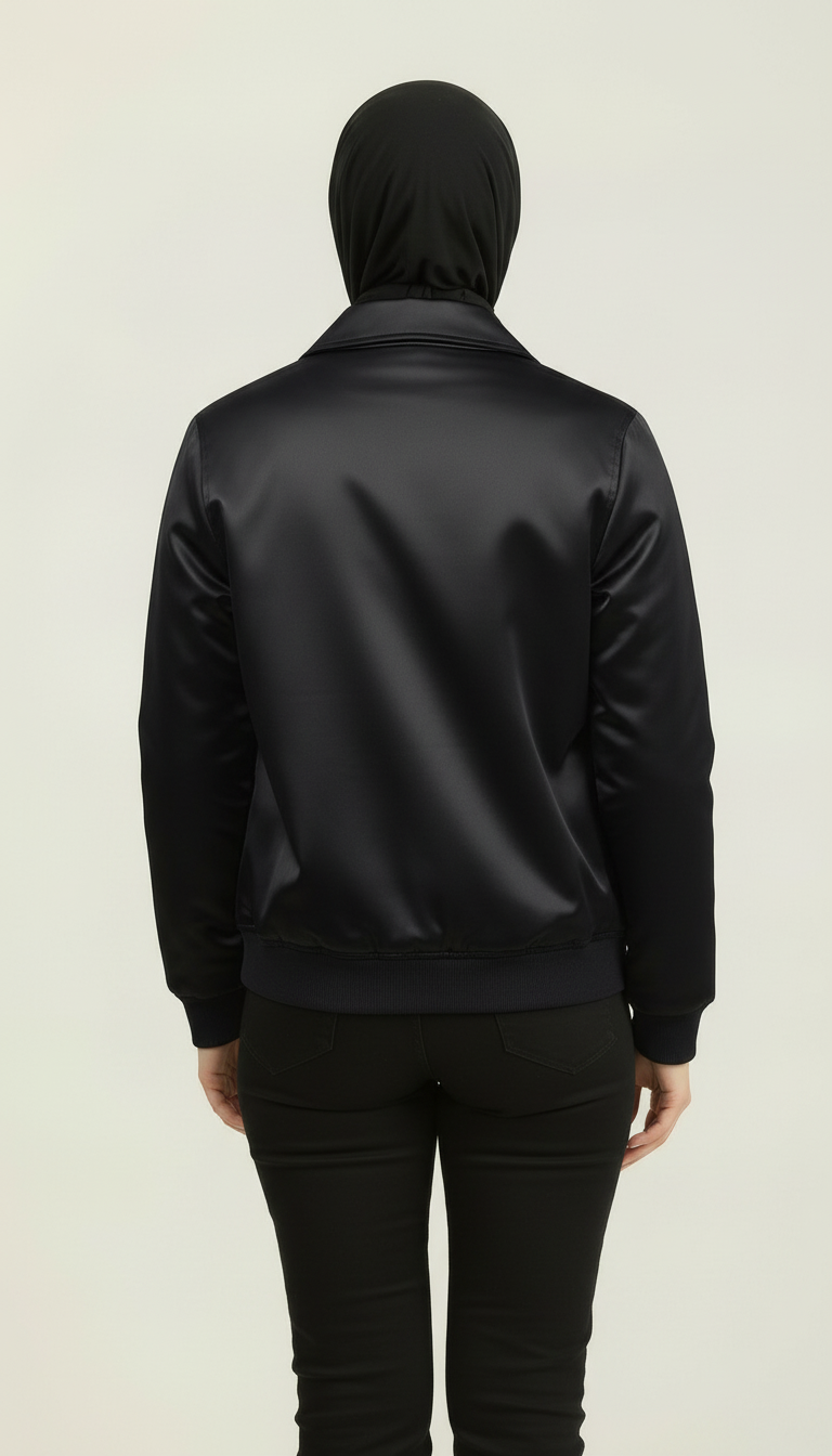 Expertly manufactured in Pakistan and inspired by high-street luxury outerwear, the Silken Noir Bomber combines comfort, warmth, and modern styling. A lightly quilted inner lining offers winter-ready insulation without bulk, while the soft satin finish drapes elegantly over the body — ideal for dinners, office looks, and elevated everyday outfits.
