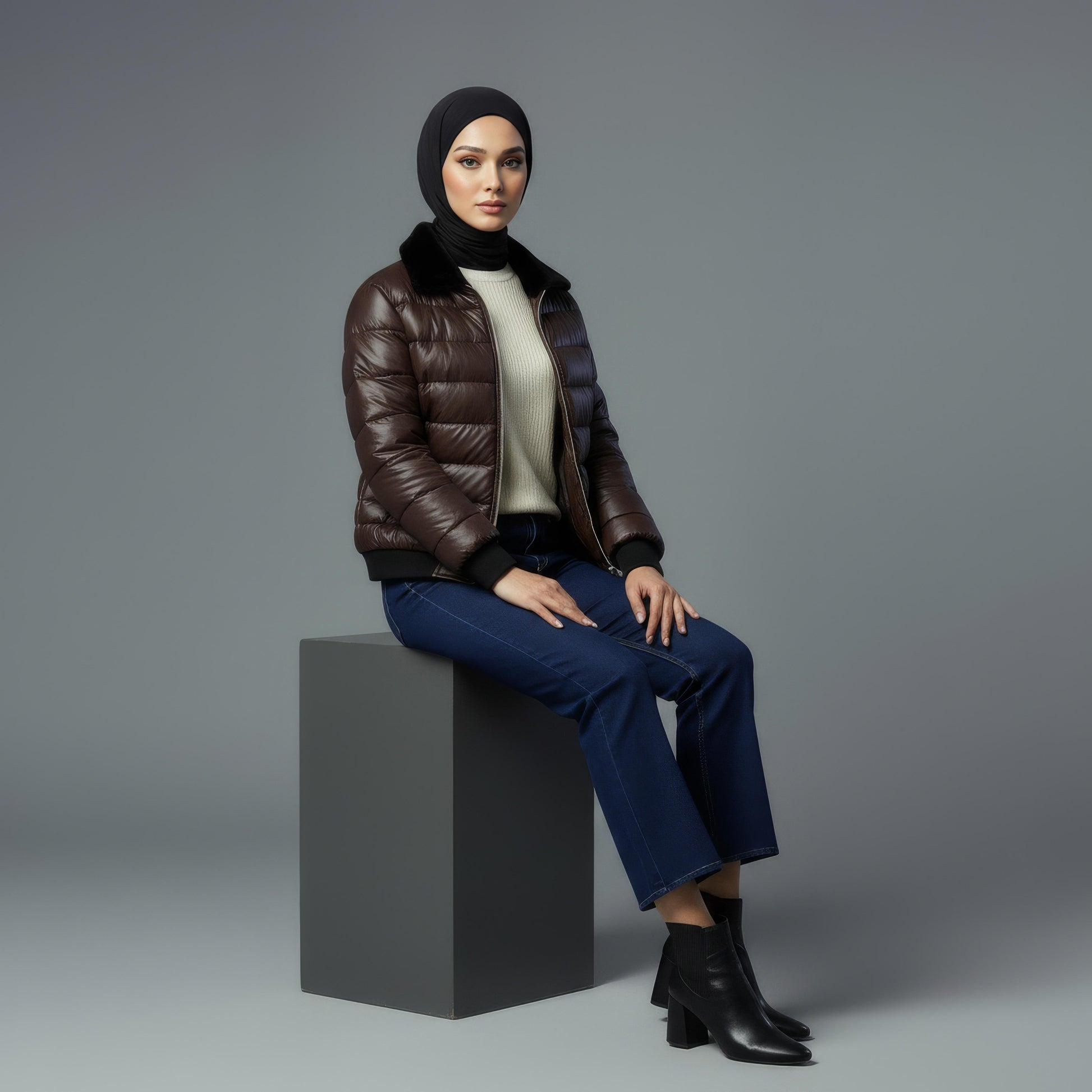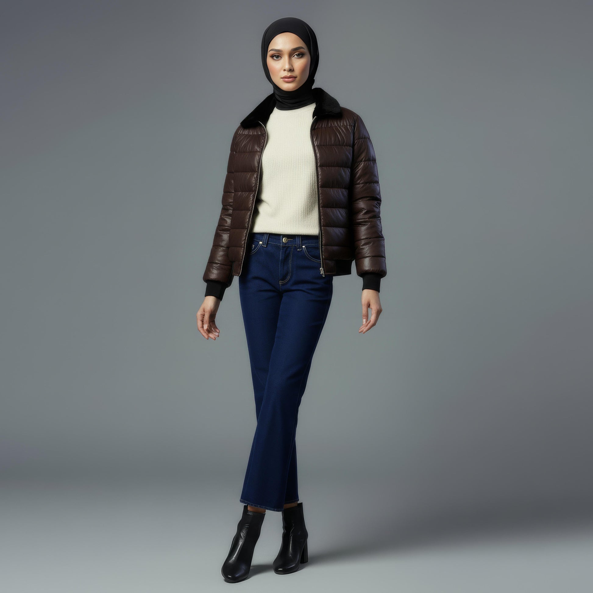 Structured with horizontal padding and detailed with metallic zippers, this jacket pairs seamlessly with neutral palettes, minimalist fits, and sophisticated winter outfits. The silhouette is flattering yet functional, giving you a perfect balance of style and comfort.